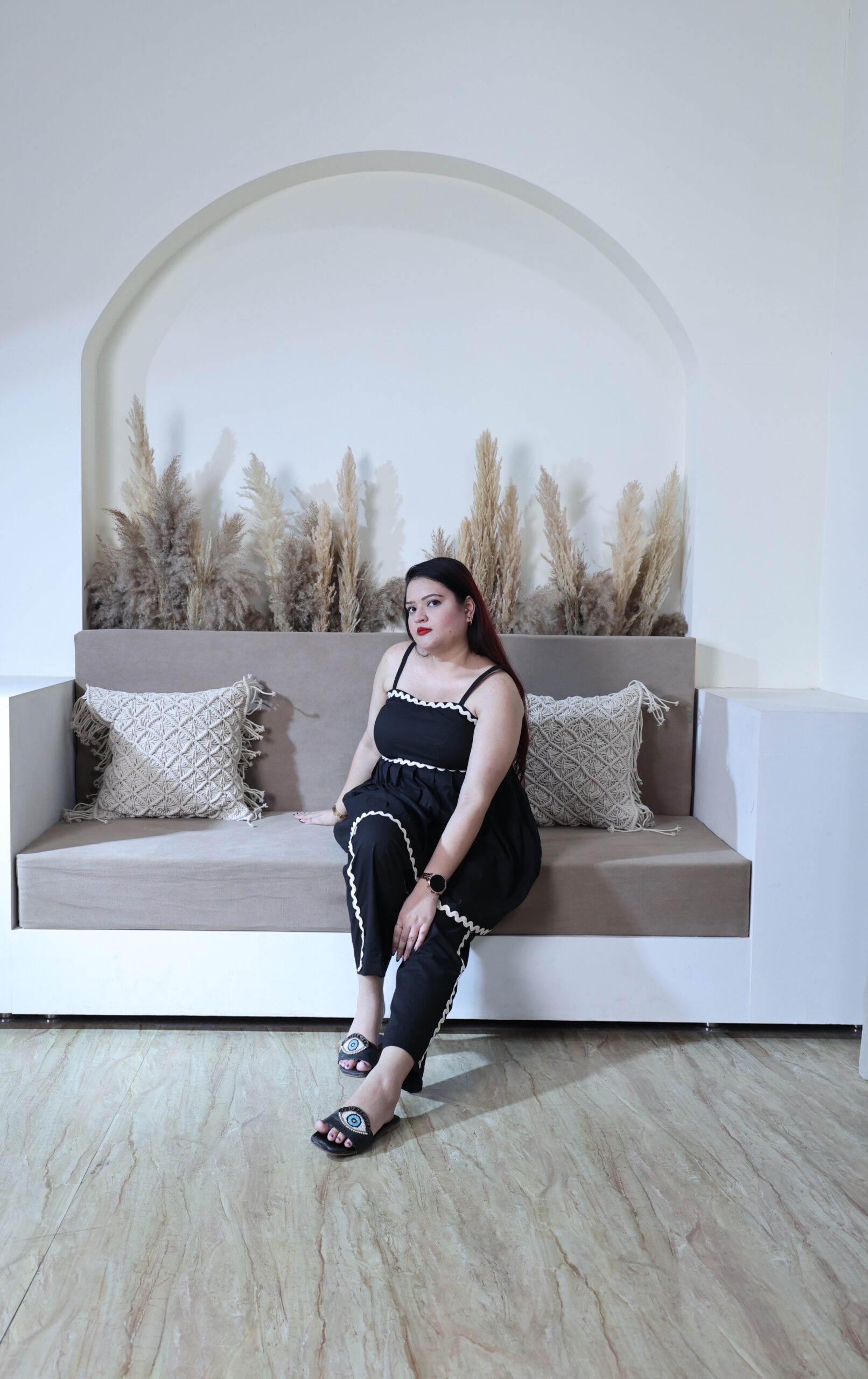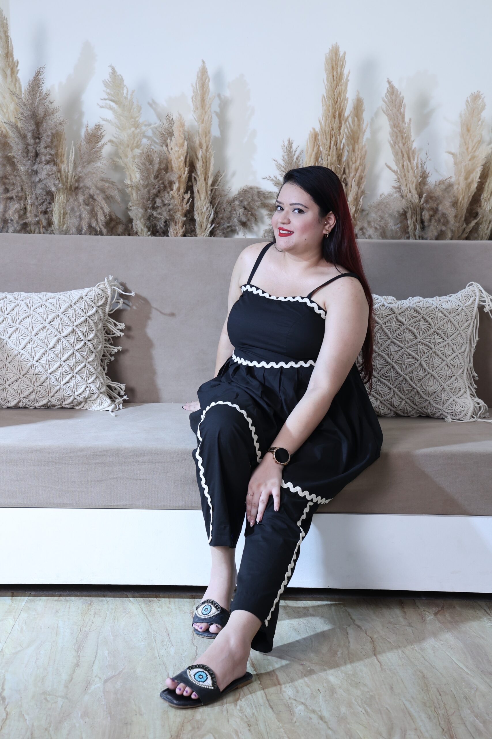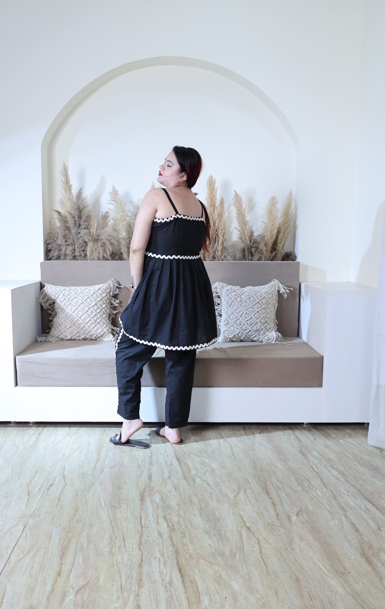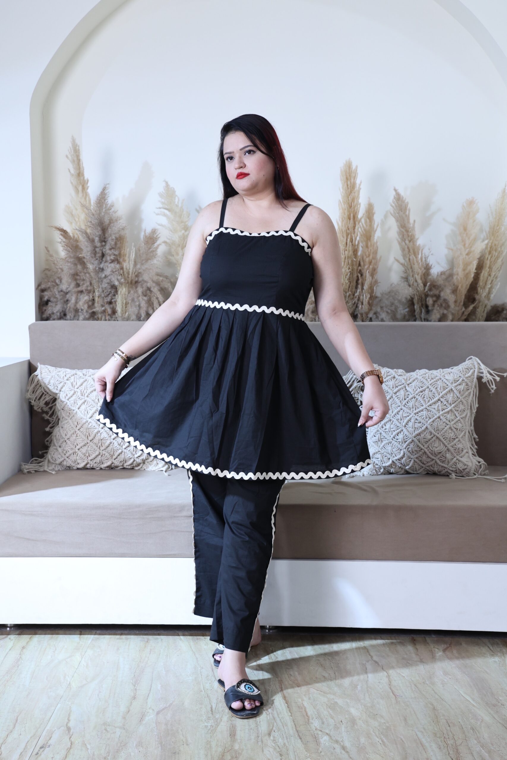 This outfit is a striking black set that blends comfort and elegance effortlessly. The sleeveless tunic-style top features delicate spaghetti straps and a flowy, flared silhouette, adding a touch of feminine grace. White scalloped trim accents the neckline and waist, creating a beautiful contrast against the deep black fabric. Paired with matching straight-cut pants that also carry the same trim detail, this ensemble strikes the perfect balance between casual charm and elevated style. Whether for a relaxed day or a chic outing, this outfit offers versatility with a fashionable edge.