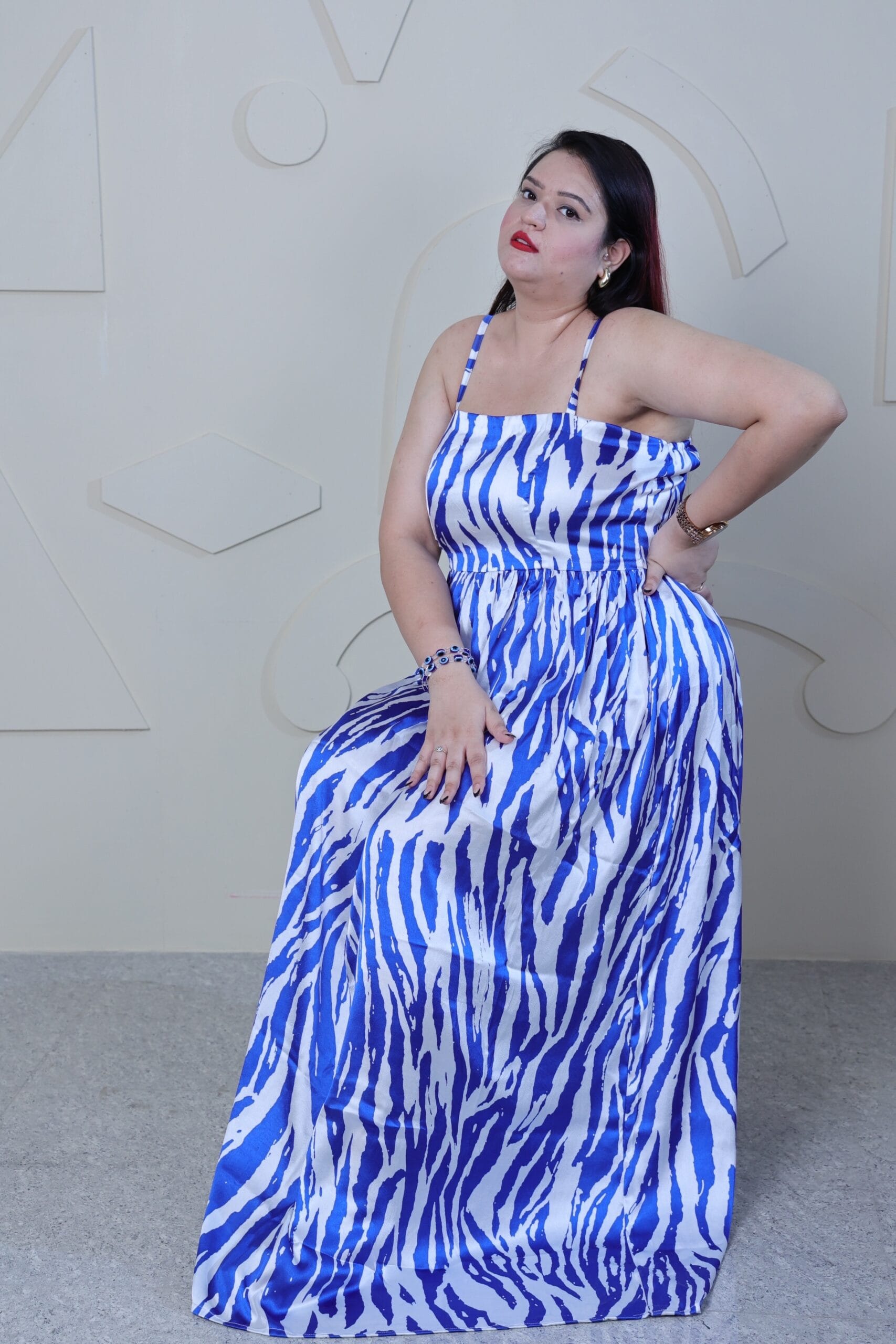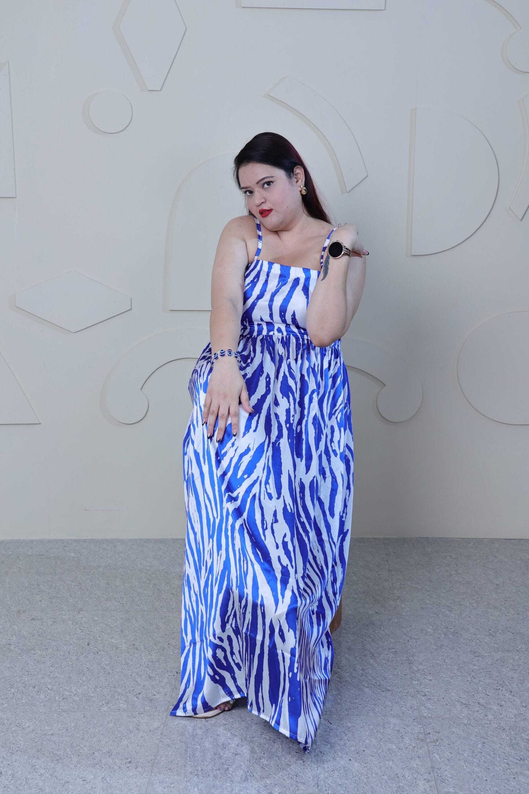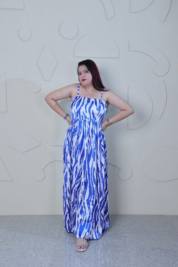 This dress is a striking blue and white maxi dress featuring a bold abstract pattern. It has thin shoulder straps and a straight neckline, offering a flattering silhouette. The fitted bodice flows into a loose, flowy skirt, creating a comfortable and airy look. It is perfect for summer days or casual outings.