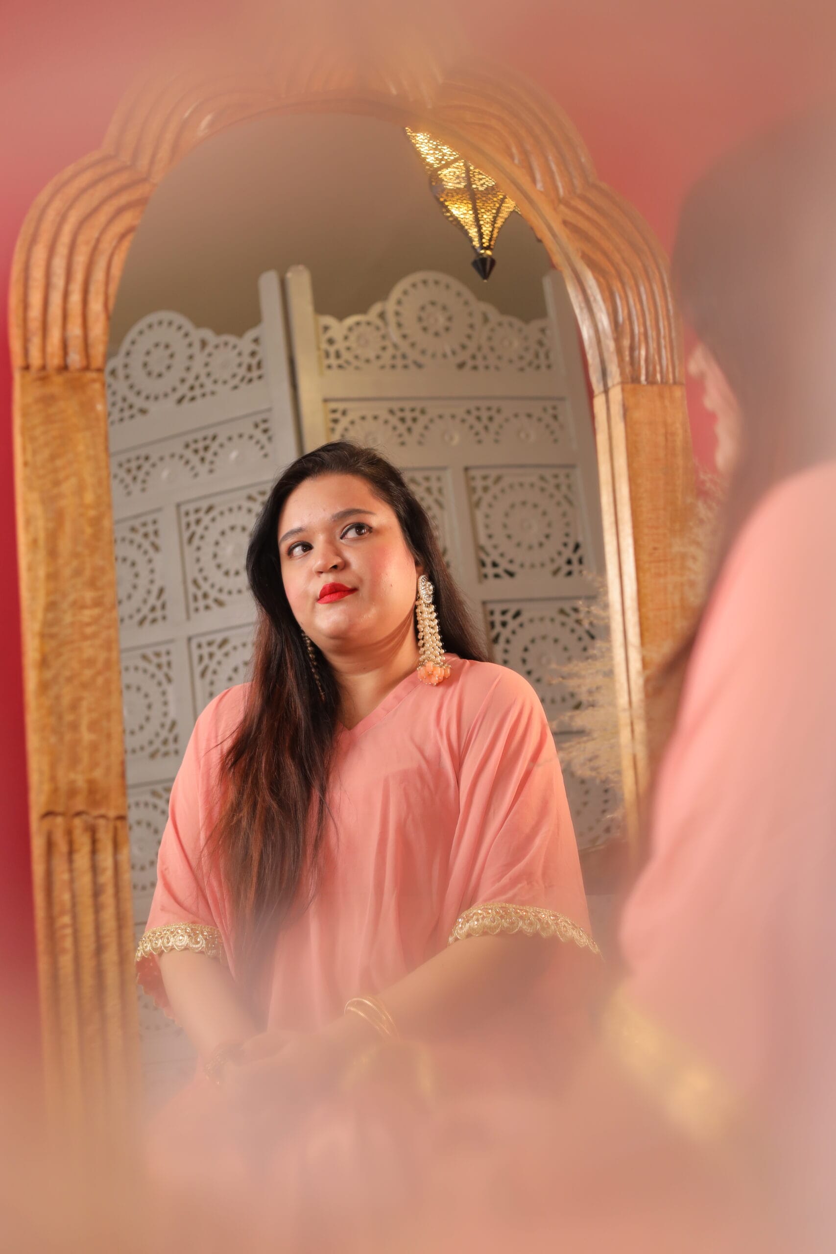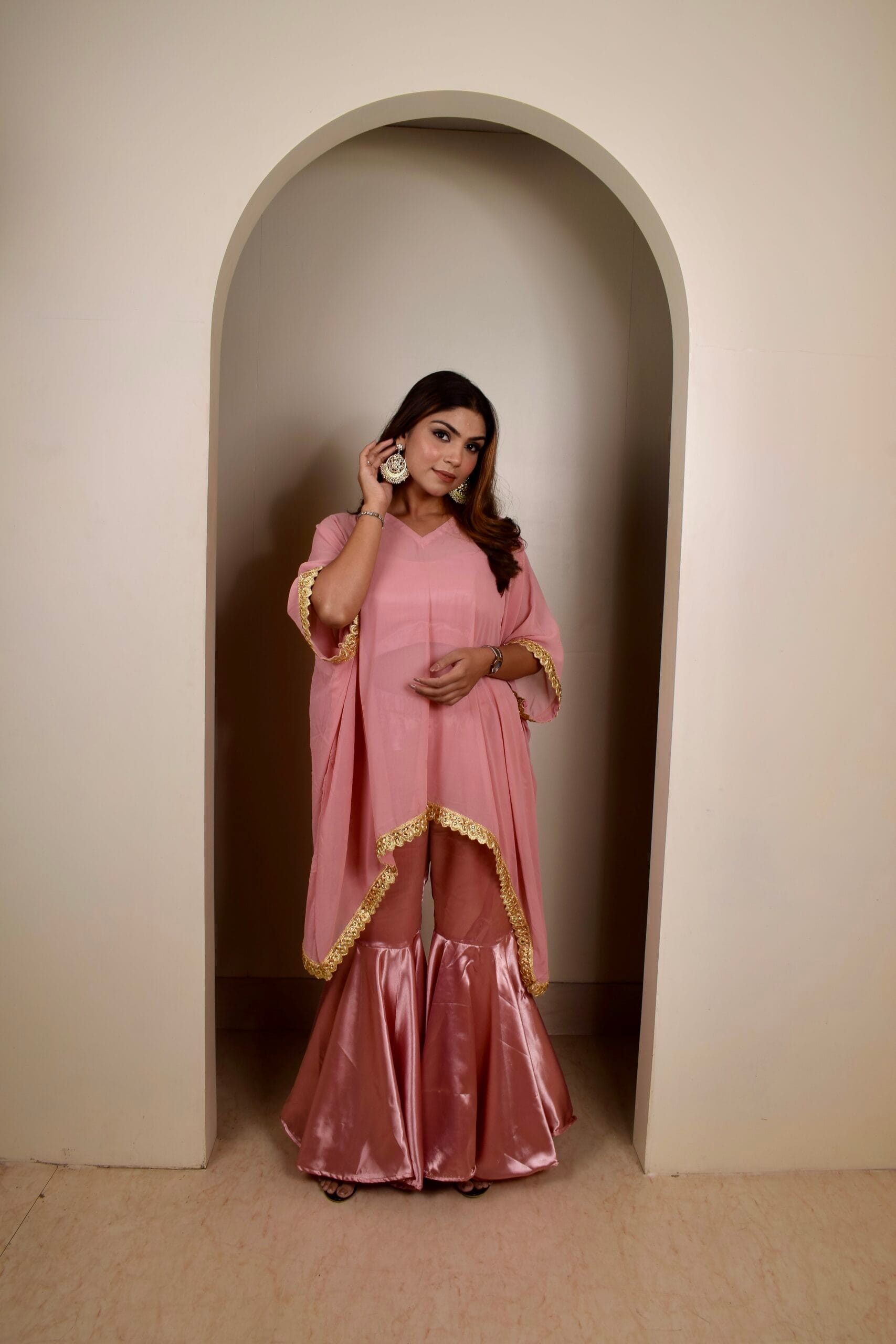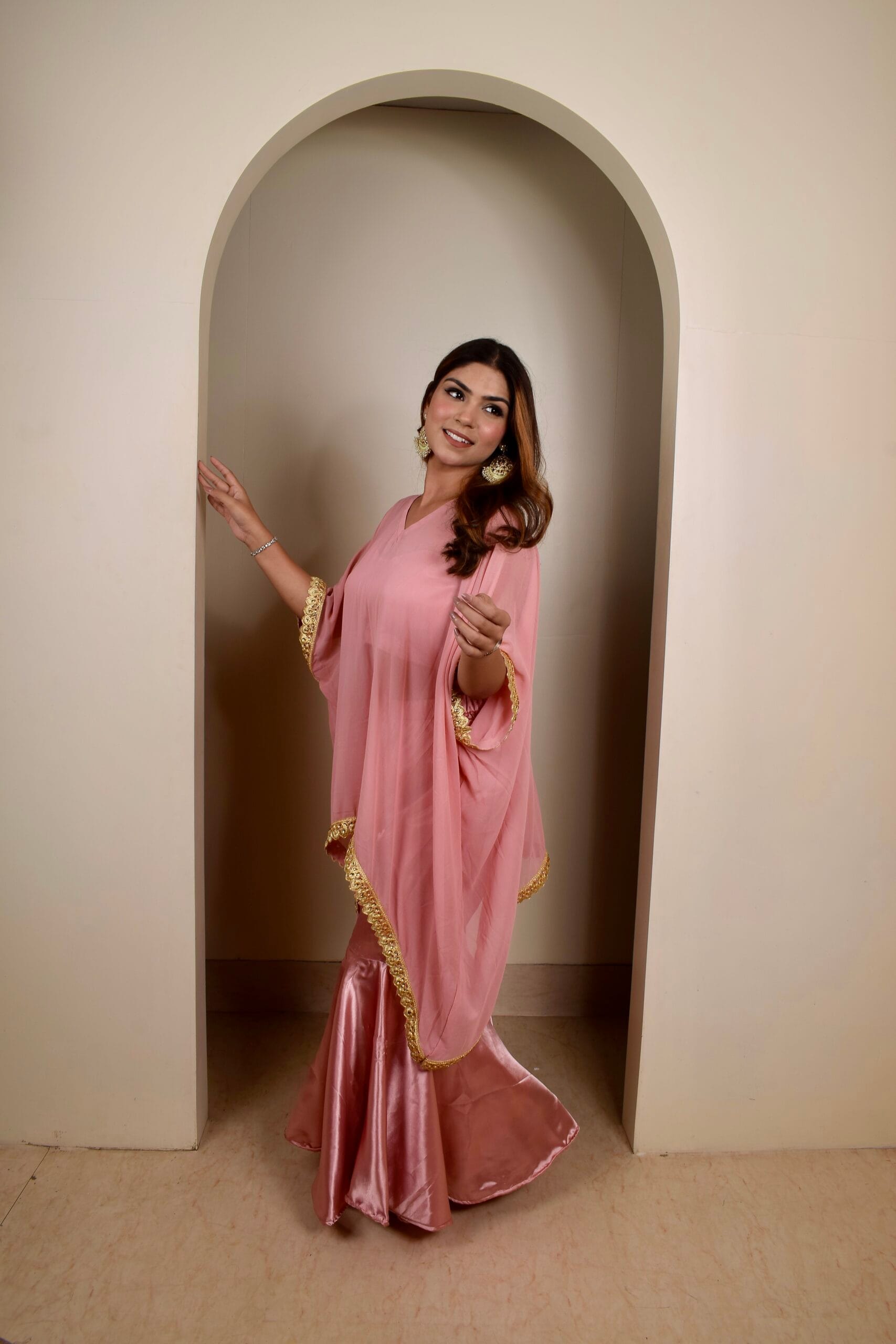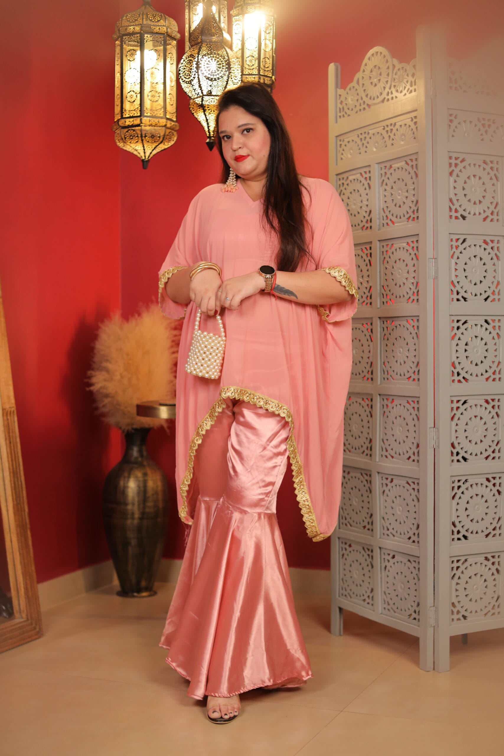 The kaftan adorned with intricate golden lace detailing, flows beautifully, adding a touch of sophistication with a crop top. Paired with satin flared sharara pants, this ensemble creates a stunning silhouette that’s ideal for festive occasions, intimate gatherings, or weddings. The soft blush hue enhances the outfit’s femininity, while the lightweight fabric ensures all-day comfort.