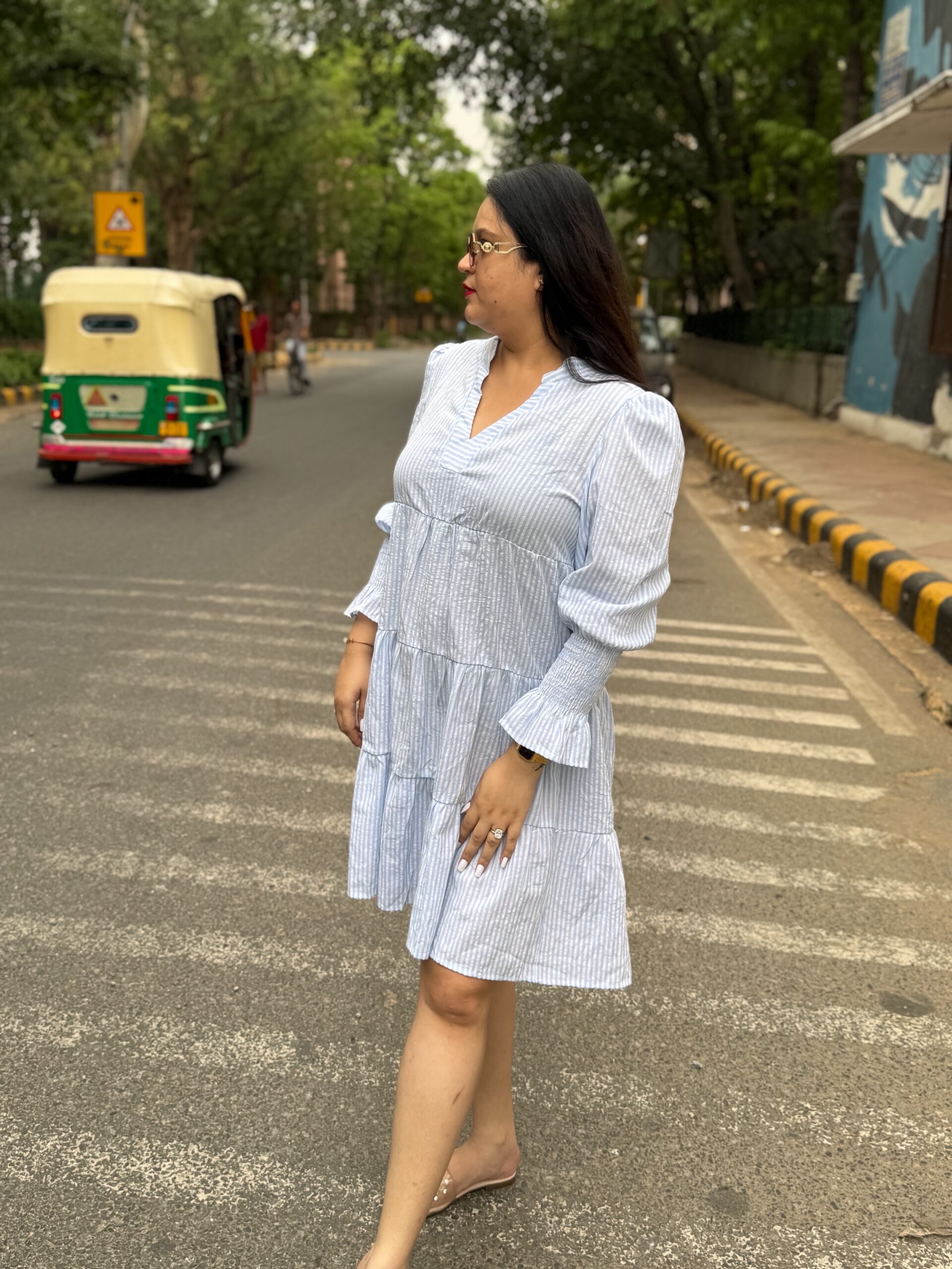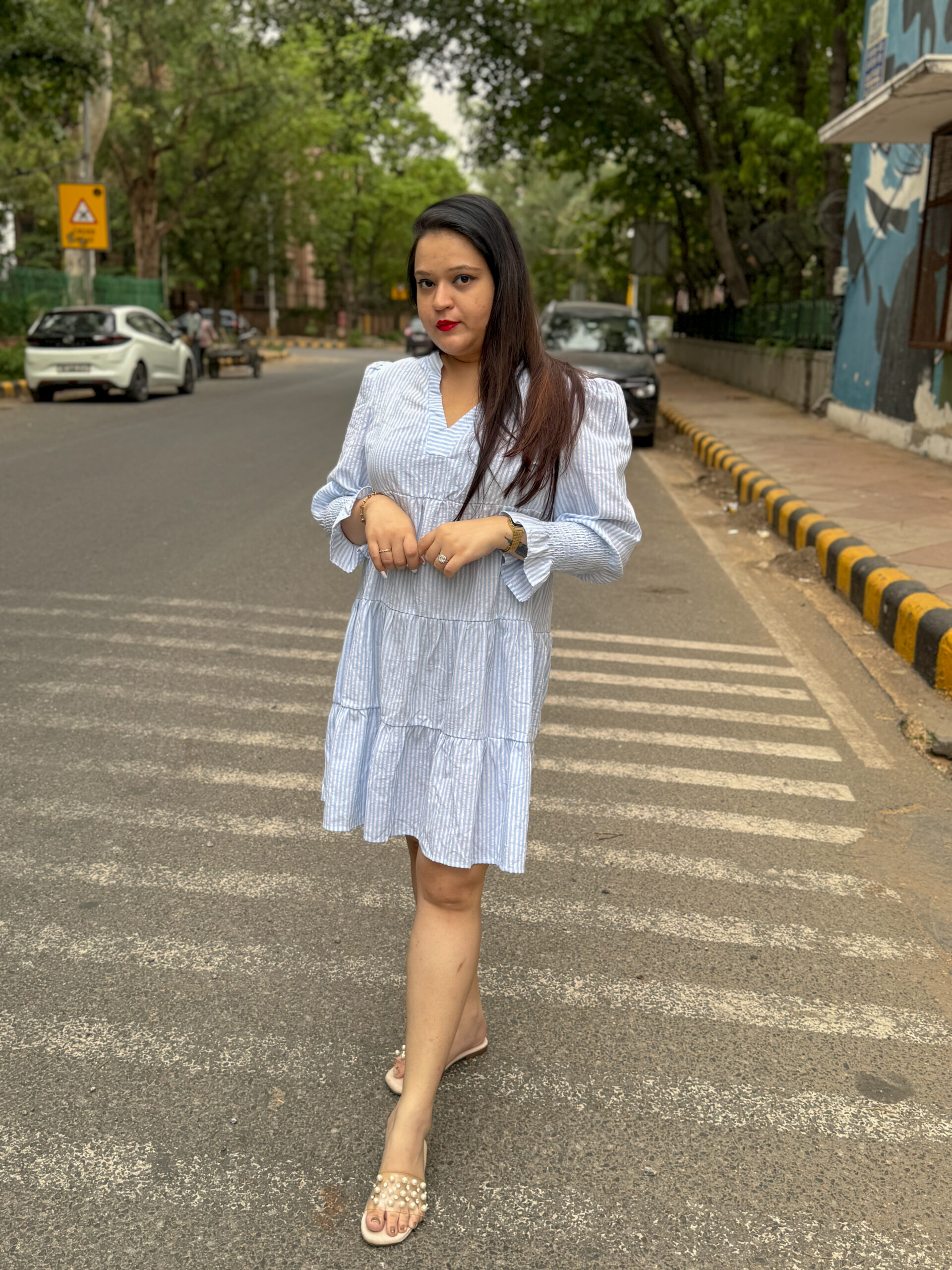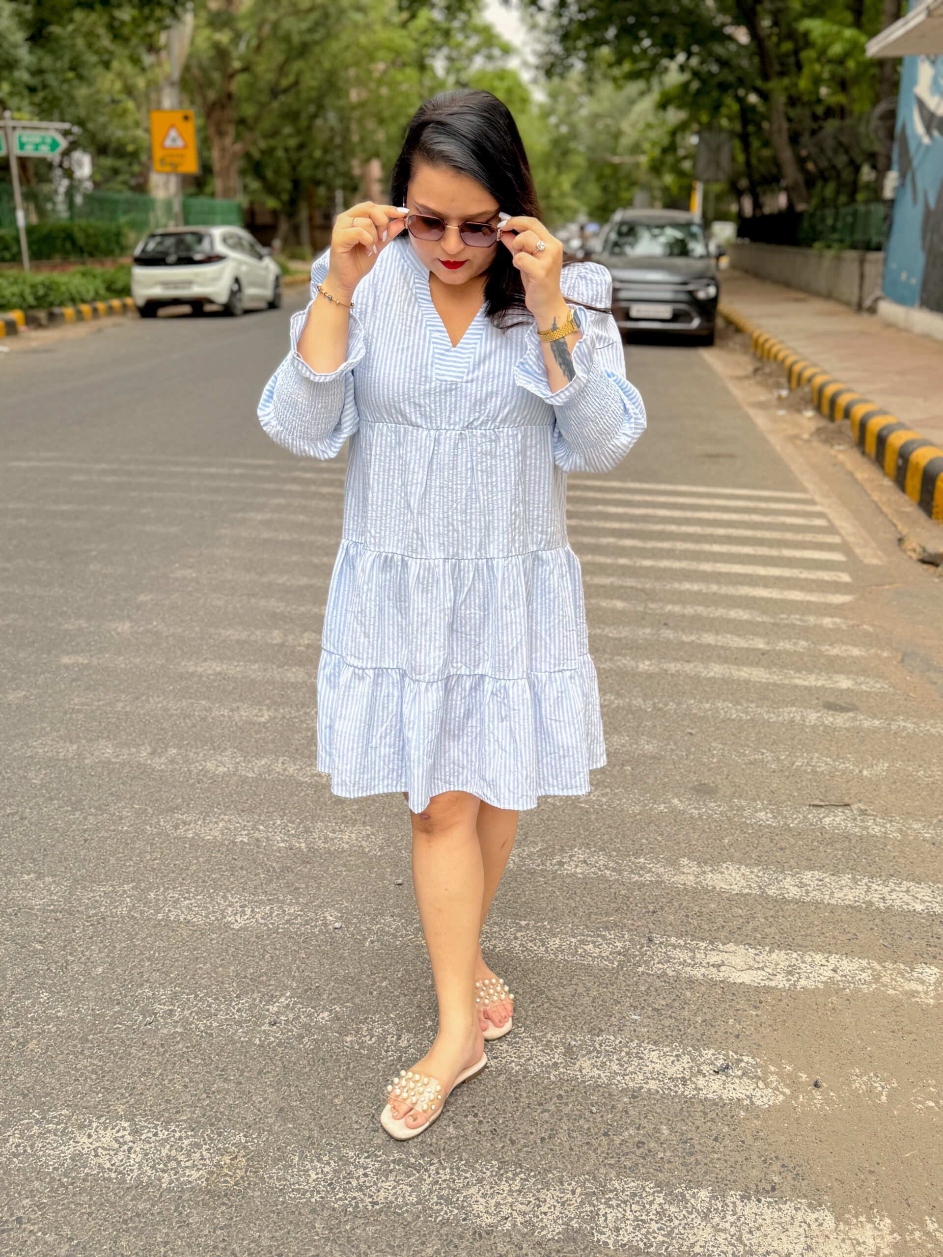 Step into effortless charm with our City Breeze Striped Dress. Designed in a soft powder-blue and white pinstripe, this dress features a relaxed A-line silhouette with delicate puff sleeves and a flattering tiered hem. The lightweight cotton-blend fabric ensures breathability and comfort, perfect for sunny day strolls or weekend brunches. Styled with pearl-embellished flats or minimal sneakers, this dress blends casual elegance with urb