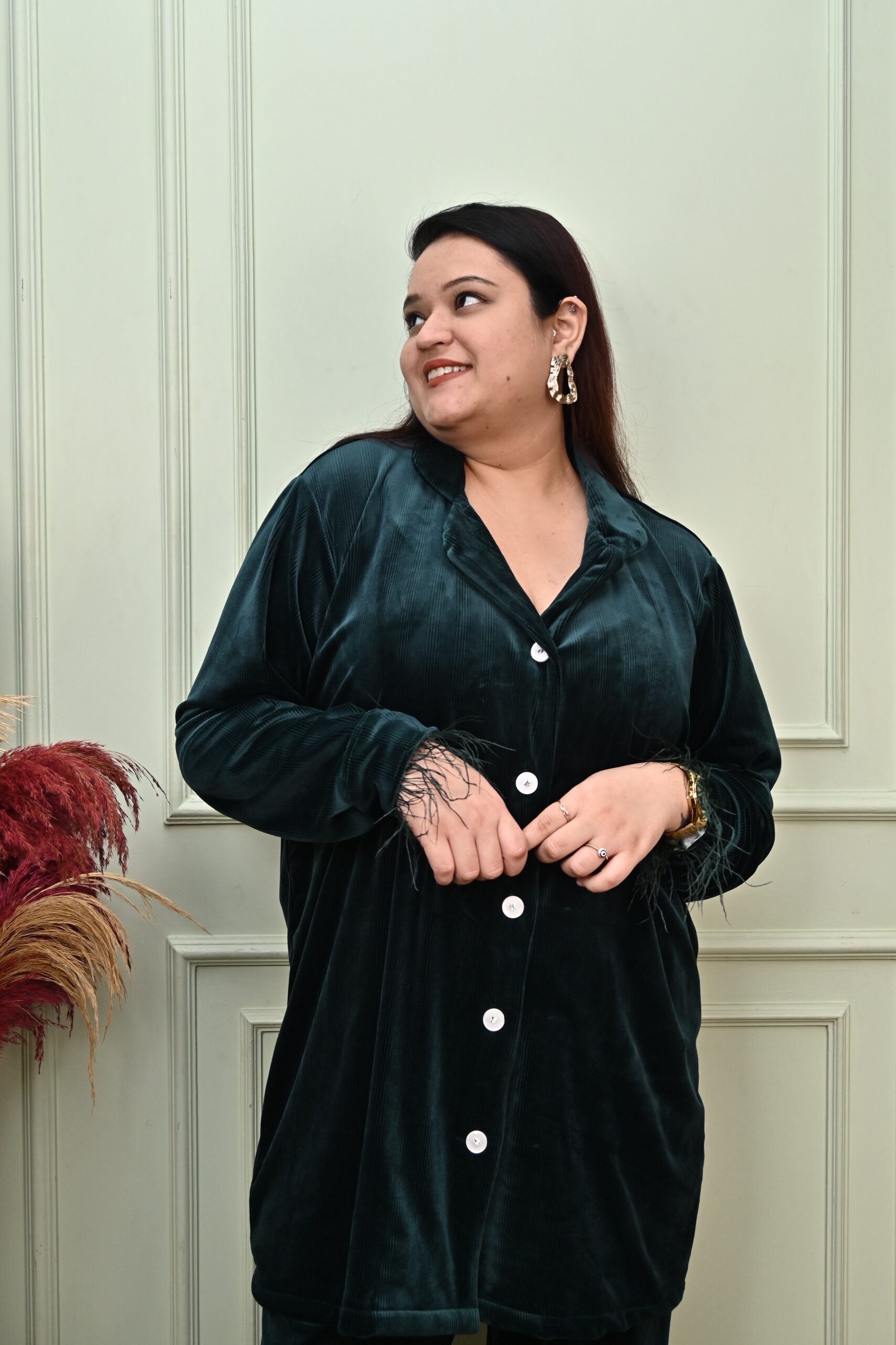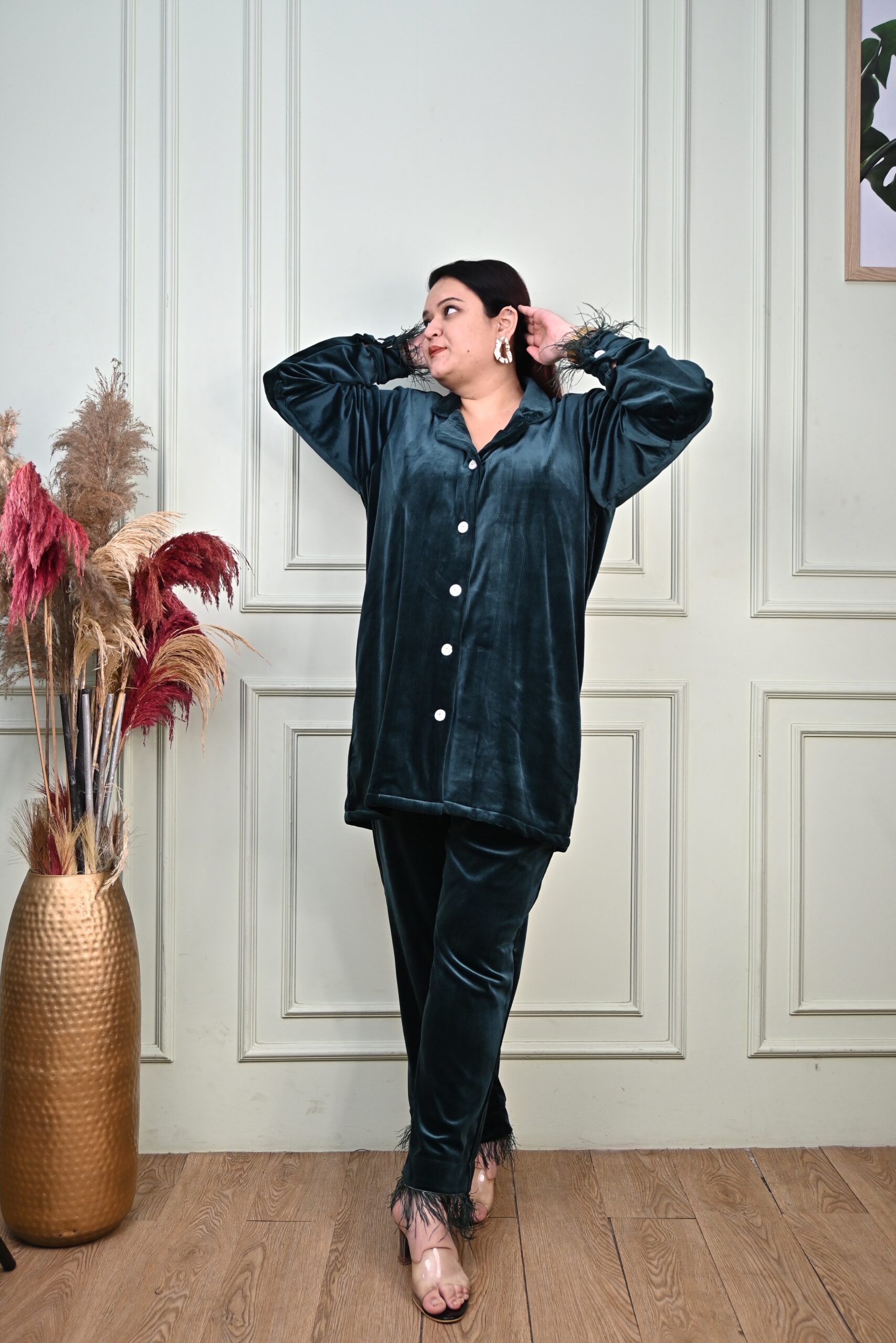 Elevate your loungewear game with the Luxe Feather Lounge Set, designed for those who love effortless glamour. Made from ultra-soft velvet, this set features a relaxed button-down shirt with a classic collar, paired with matching straight-leg pants. Delicate feather detailing at the cuffs and hem adds a playful, sophisticated touch, making it perfect for stylish nights in or chic casual outings. Whether you’re unwinding at home or stepping out in relaxed elegance, this set ensures you do it in style.