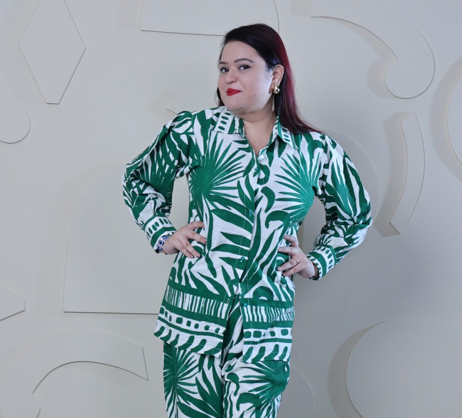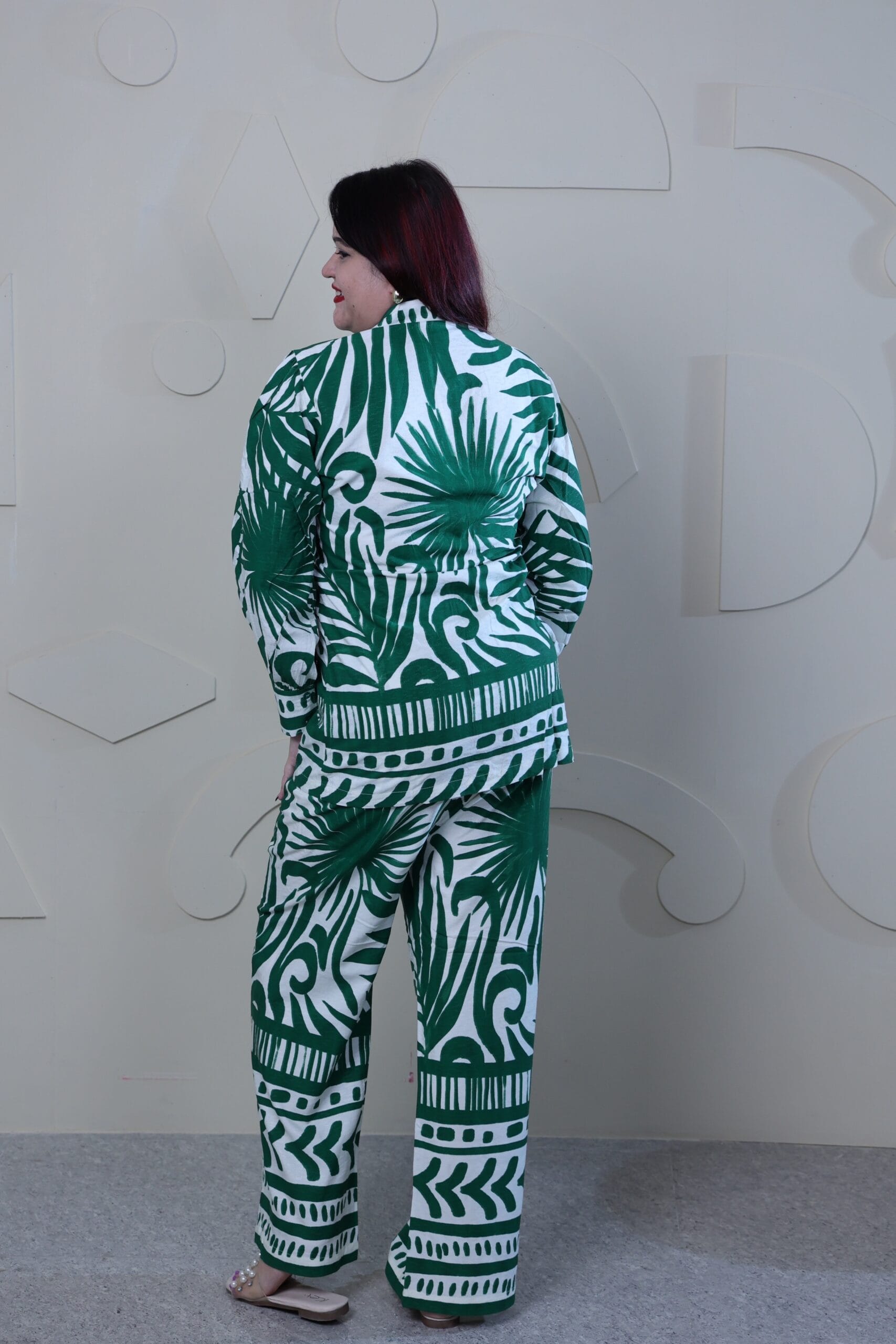 A sophisticated co-ord set in white & green color, adorned with intricate green embroidery. This set includes a long-sleeved shirt and matching wide-leg trousers, both decorated with a delicate pattern. The shirt has a classic button-down design with a pointed collar. The sleeves are long, with cuffs that add to the structured appeal of the garment. The trousers are wide-legged providing a comfortable and stylish fit. They share the same embroidery as the top, creating a cohesive look.