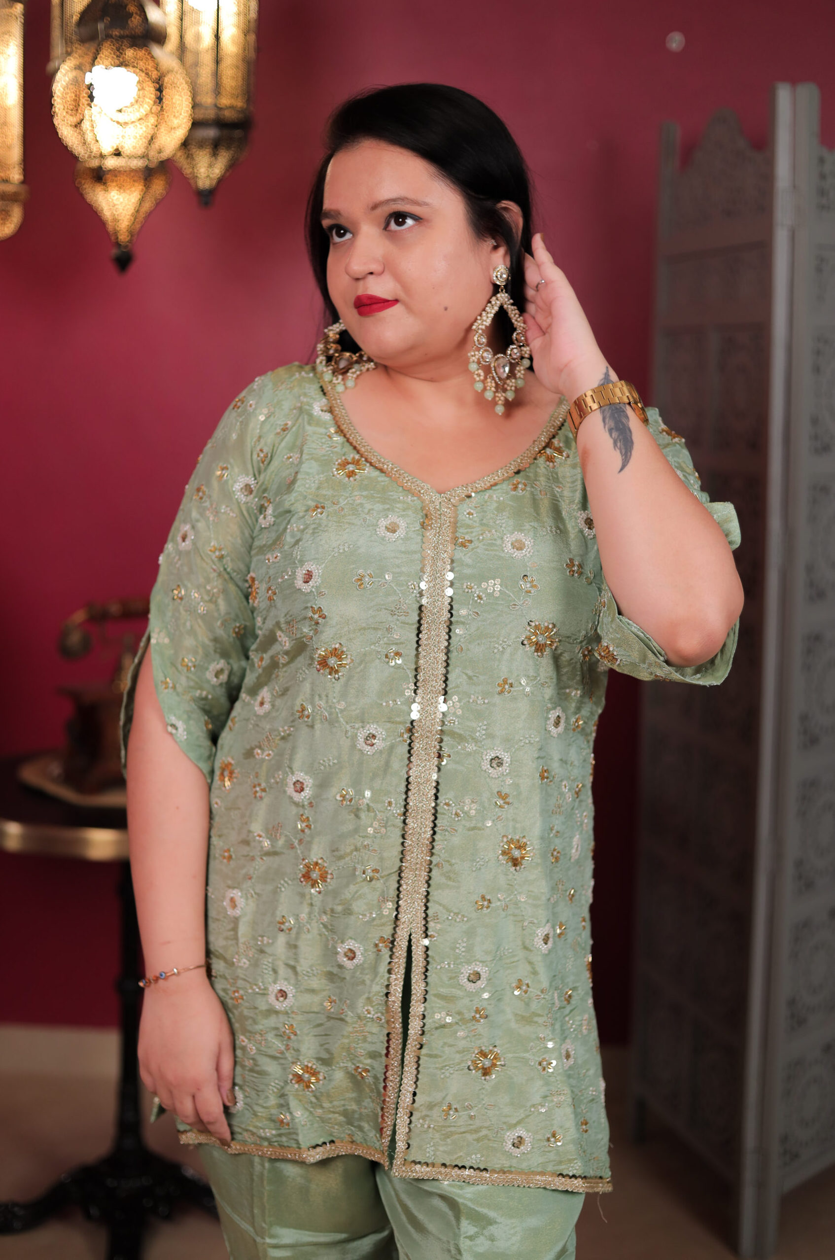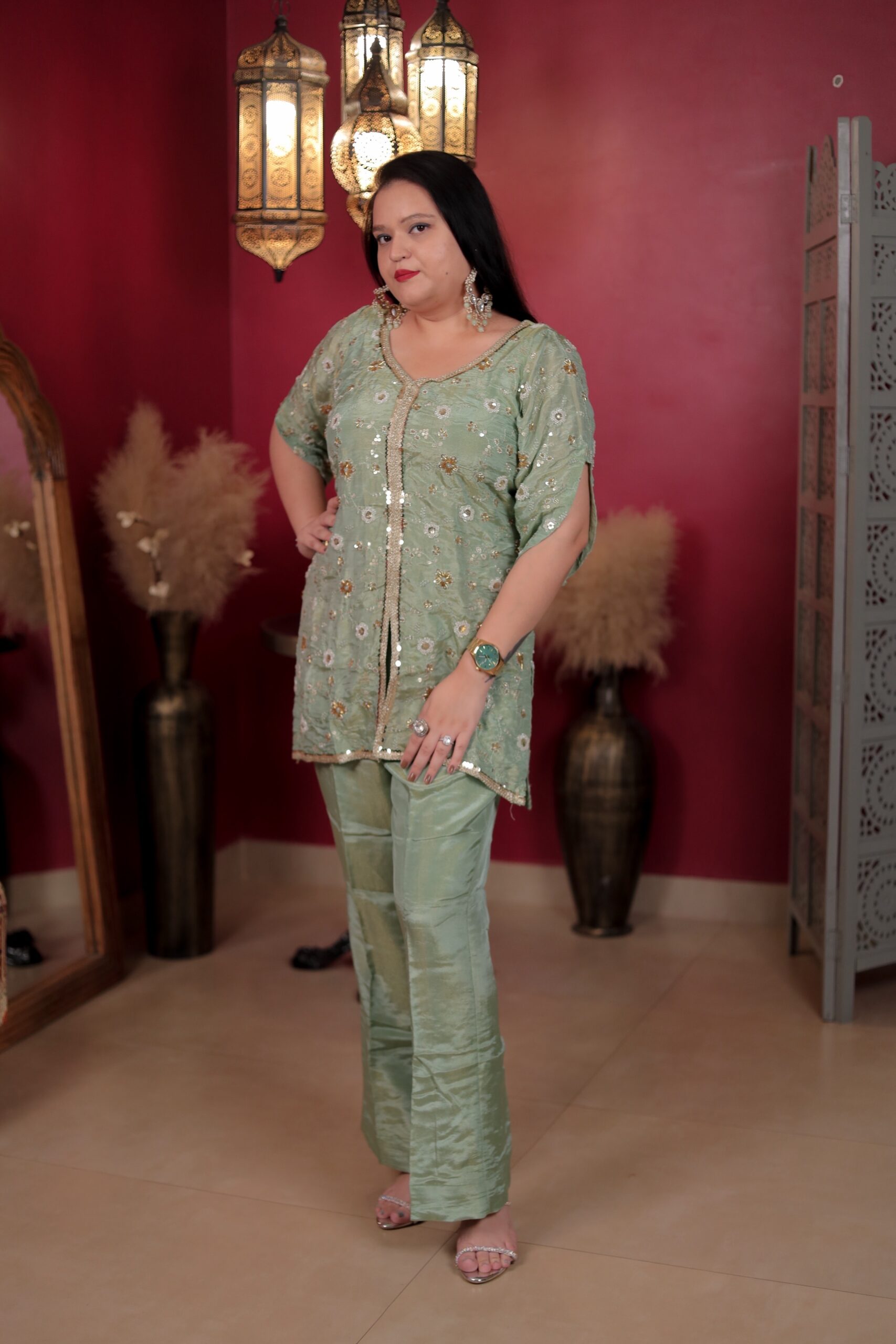 Step into elegance with our Mehfil Glow Ensemble — a pastel green dream adorned with delicate mirror work and golden embroidery. The soft sheen of the fabric paired with intricate hand detailing makes it perfect for festive soirées and intimate celebrations. Subtle, stylish, and oh-so-regal — this look is all about effortless glamour. ✨