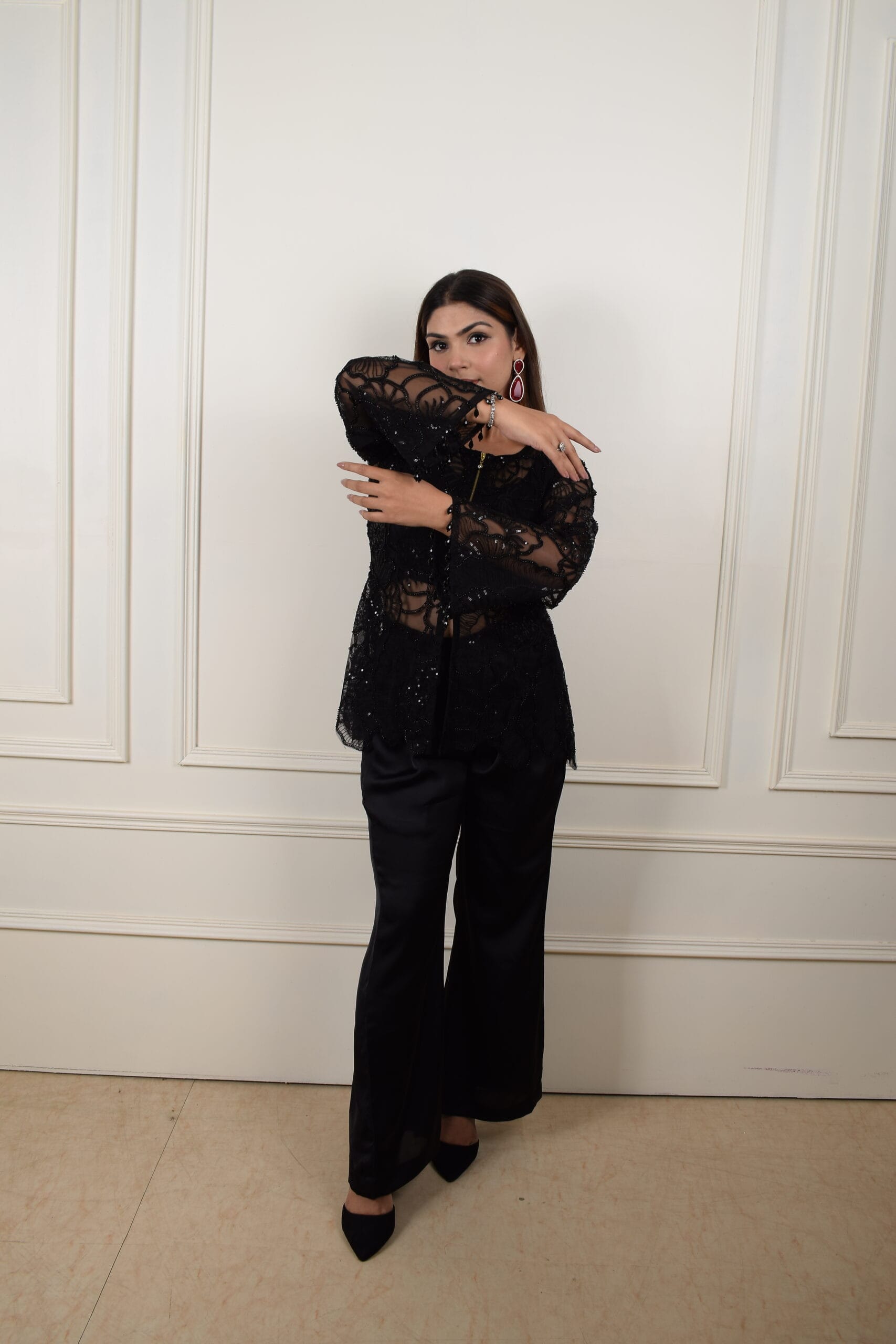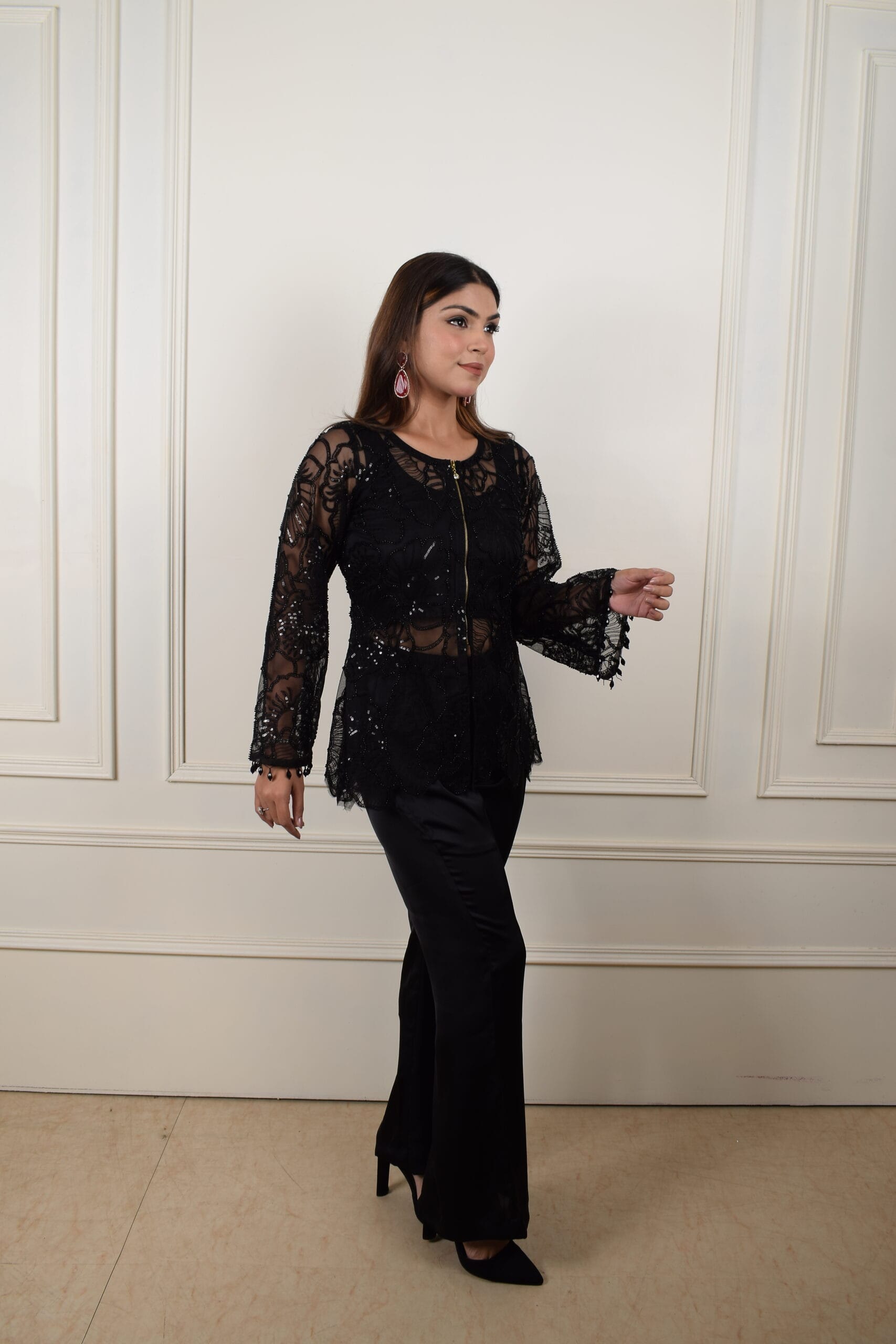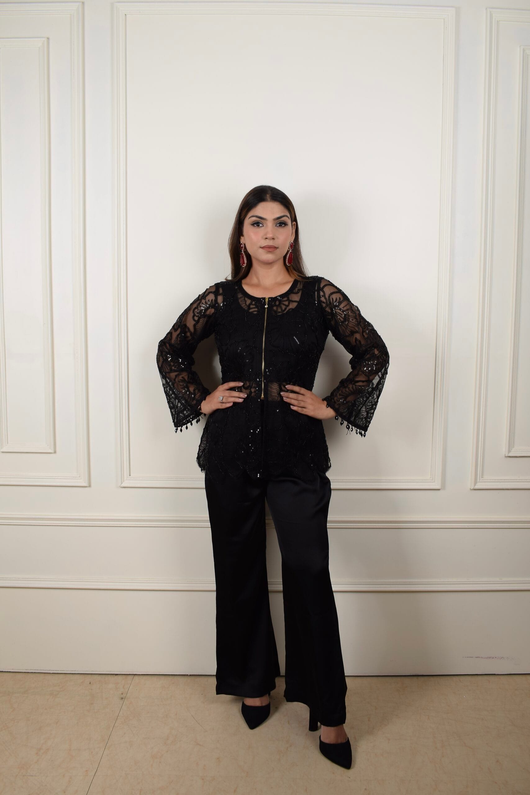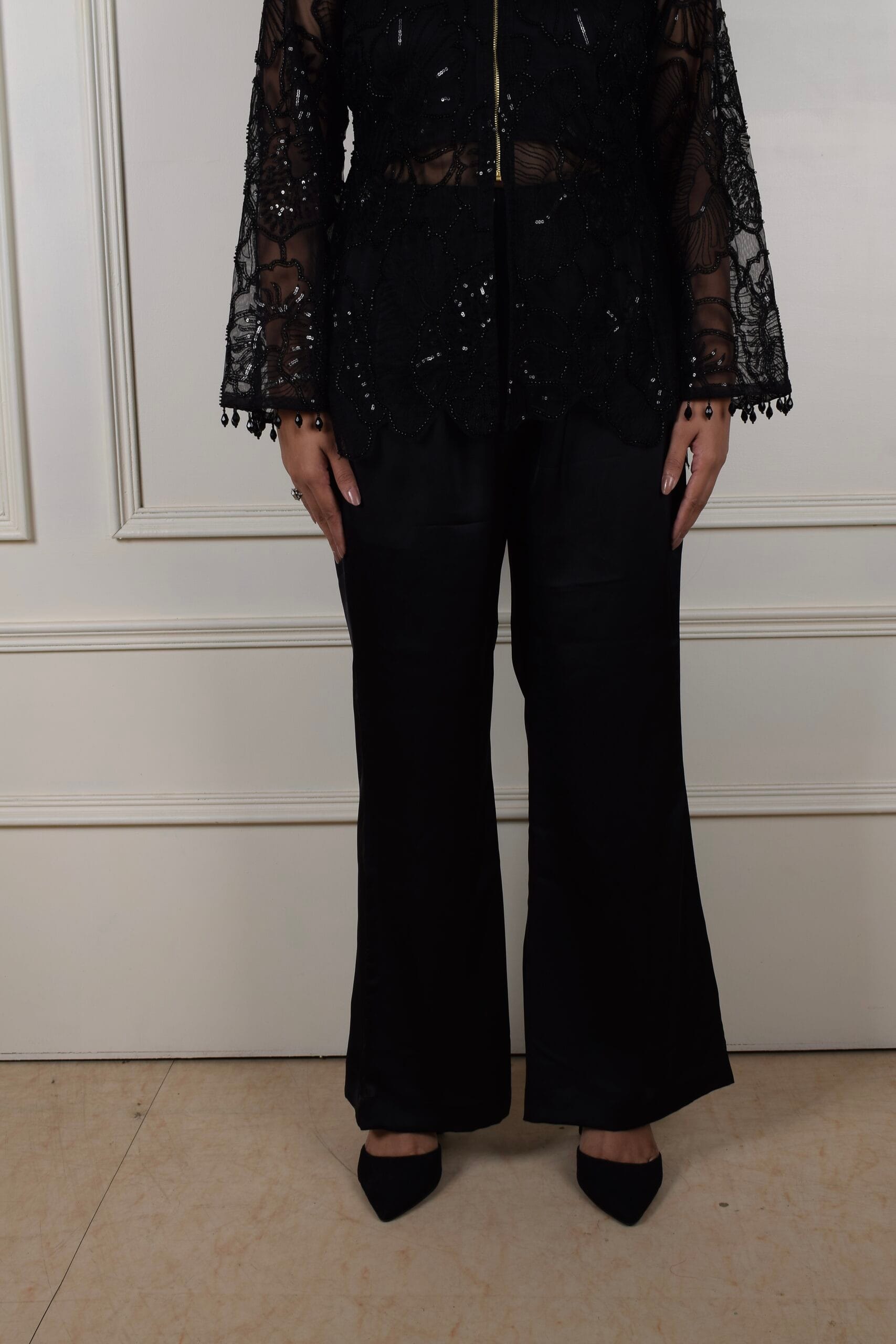 This outfit is an elegant black ensemble featuring a lace-embroidered top and wide-legged pants. The top has intricate lace details with sheer sleeves, and bell-shaped cuffs. It has a front zipper that adds a modern edge to the look, with subtle sequin embellishments that catch the light. The wide-legged black pants create a sleek, balanced silhouette.