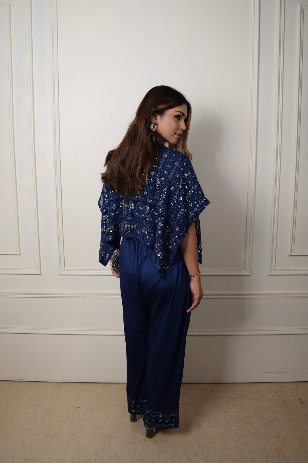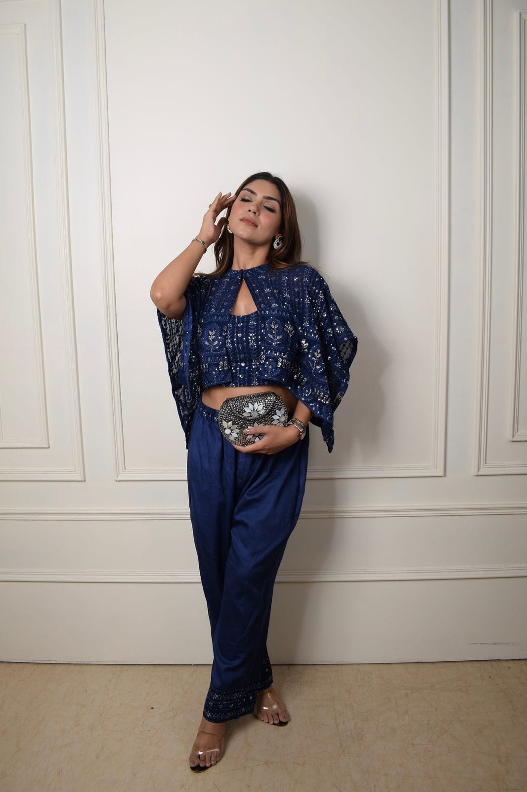 This stunning blue outfit is a perfect fusion of elegance and comfort. The cape-style top is adorned with intricate detailing, adding a touch of sparkle and sophistication. Paired with relaxed yet tailored pants, the ensemble is designed to make you feel effortlessly stylish. The rich indigo hue enhances its regal charm, while the subtle shimmer details make it a standout choice for festive celebrations, cocktail evenings, or any special occasion. This outfit is crafted for those who love to blend traditional artistry with contemporary fashion, making it a versatile addition to your wardrobe.