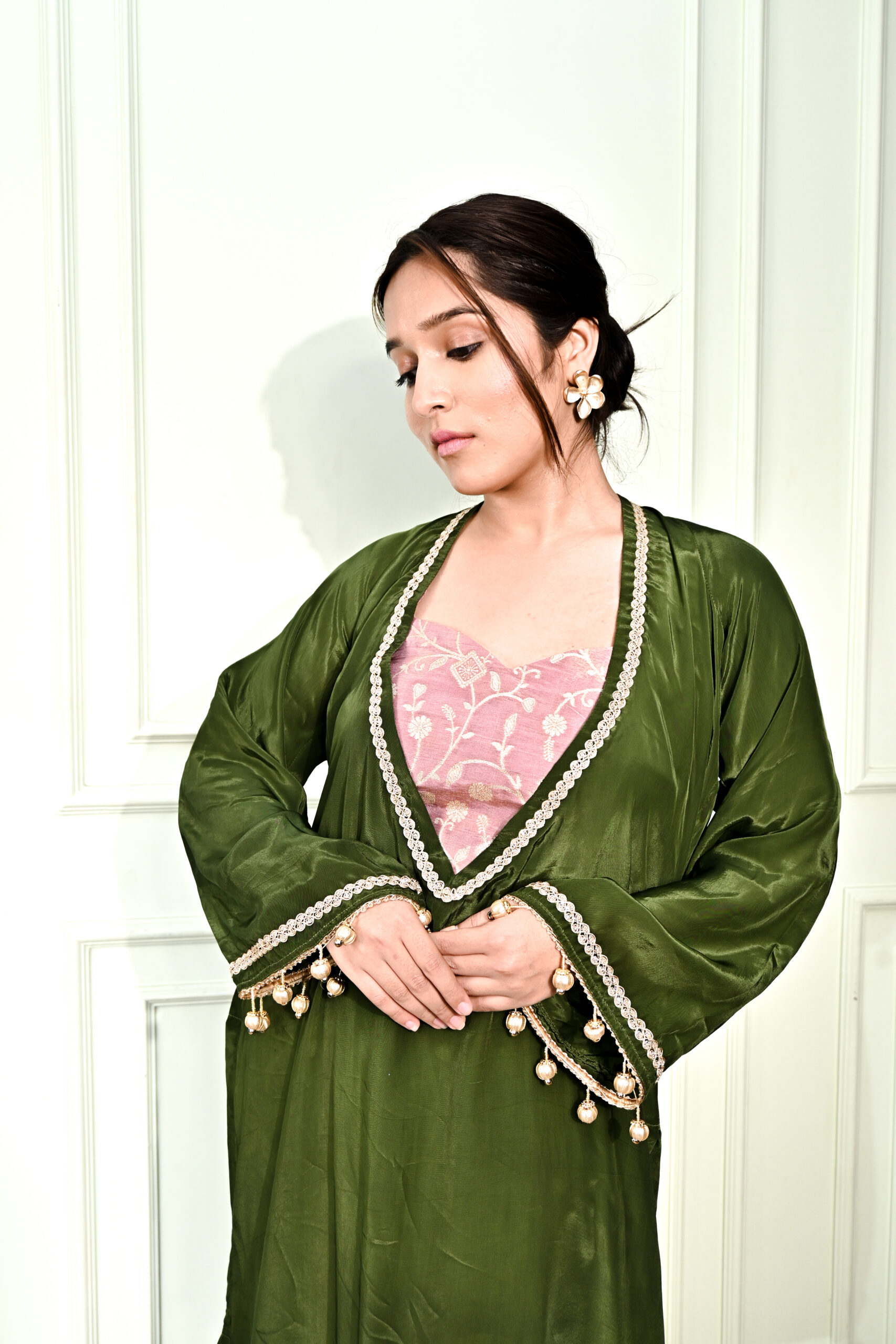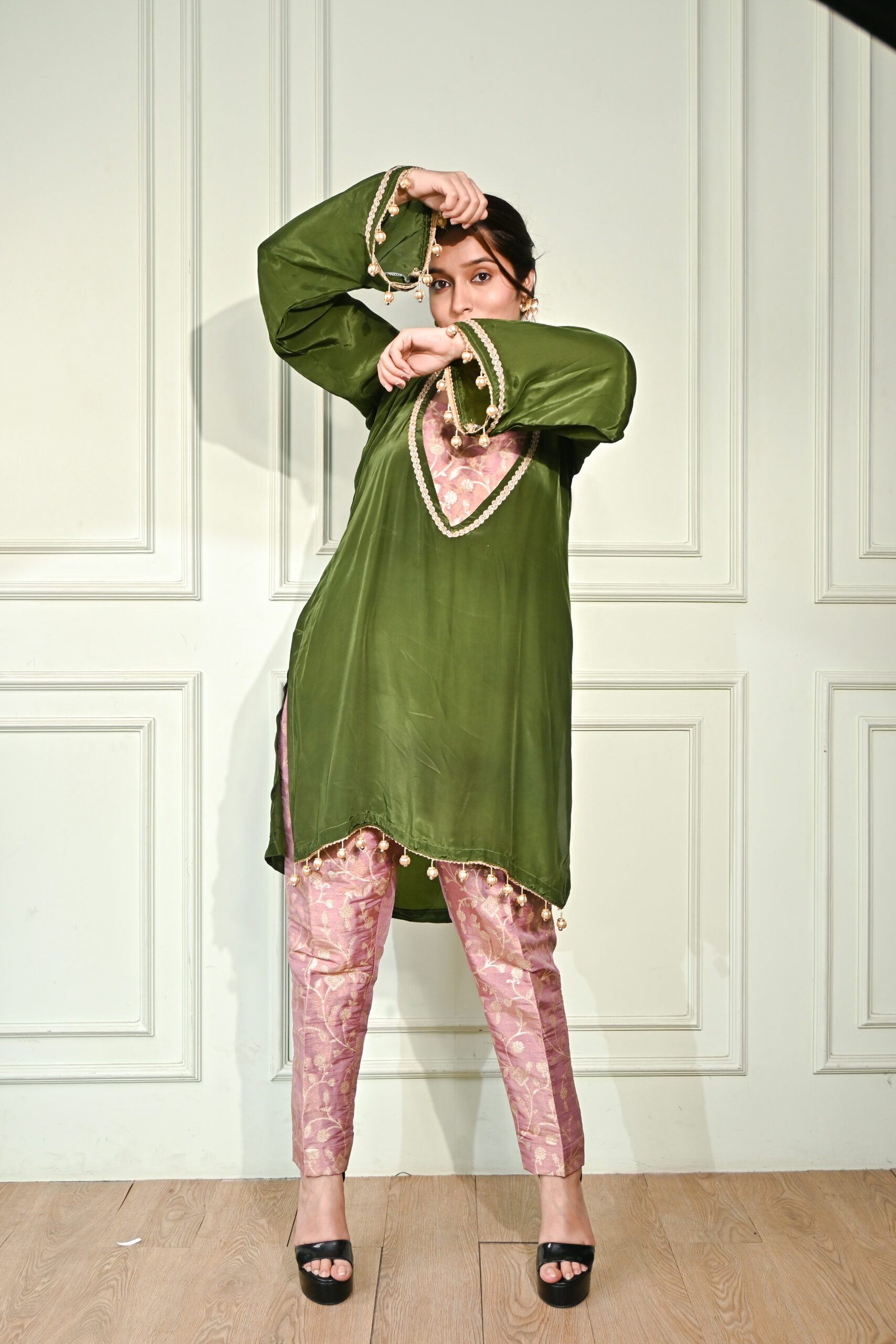 This outfit is a beautifully curated three-piece set that blends rich olive green with a delightful pink brocade. The set features a chic heart-patterned crop top, elegantly layered with an olive satin upper adorned with intricate pearl and tassel detailing. The brocade silk pants bring a regal charm, making this ensemble perfect for festive occasions, weddings, or sophisticated gatherings. The contrast of earthy green and soft pink creates a striking yet graceful appeal.
