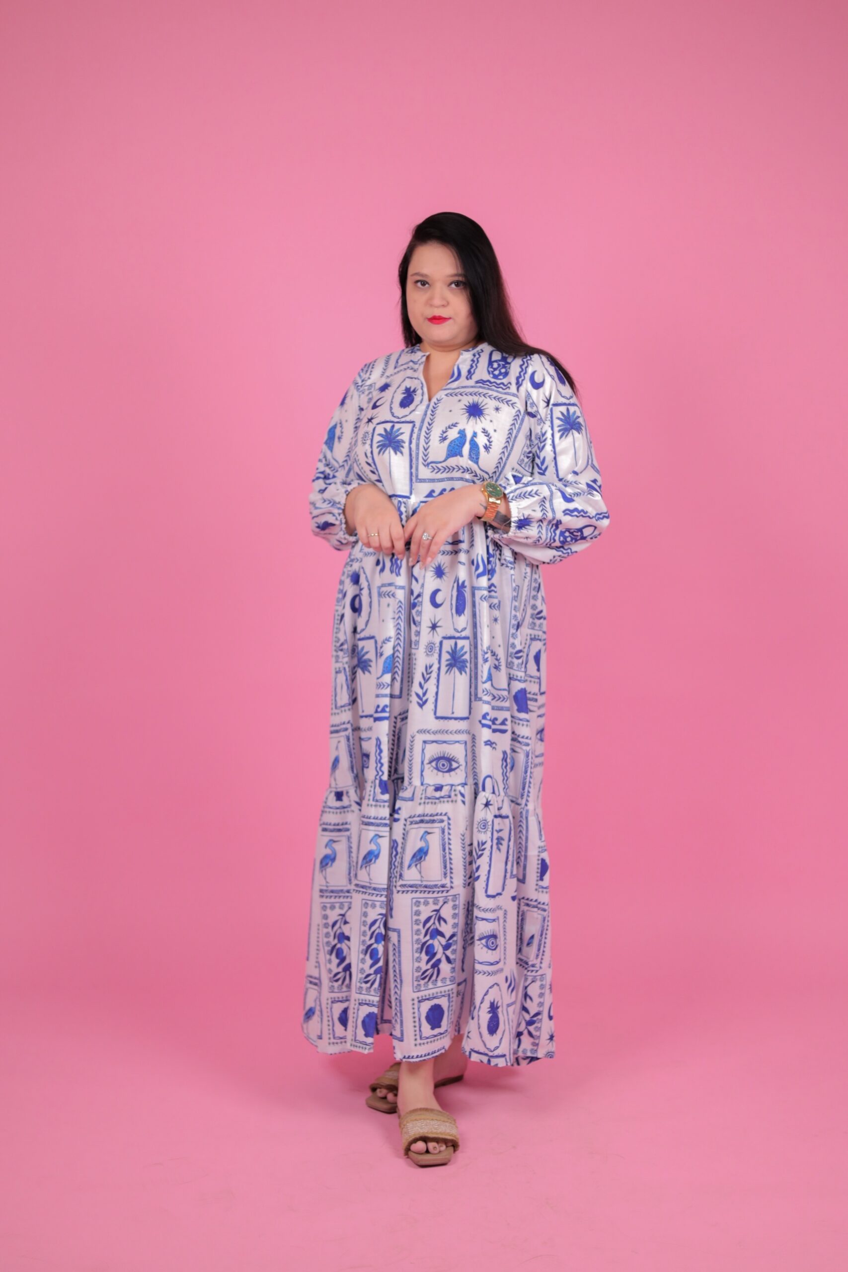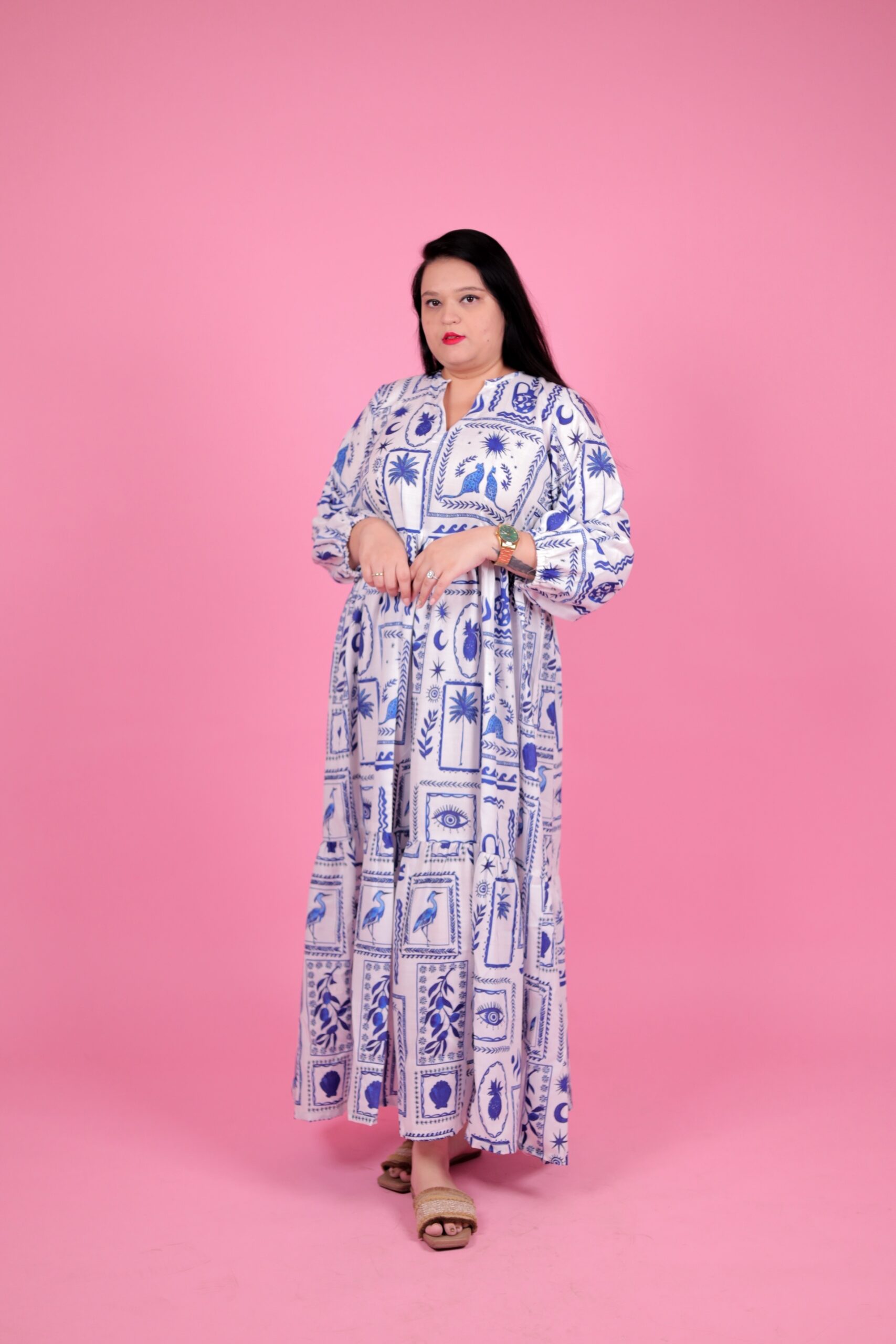 Bring effortless elegance to your wardrobe with the Santorini Breeze Maxi Dress. Designed in soft white cotton, this flowy silhouette features striking cobalt blue prints inspired by coastal charm—palms, birds, and oceanic motifs that evoke a dreamy Mediterranean vibe. The relaxed fit, full sleeves, and gathered waistline make it perfect for all-day comfort, whether you’re strolling on a holiday, attending brunch, or hosting a get-together. Pair it with flats for a laid-back look or dress it up with statement accessories for a chic evening out.