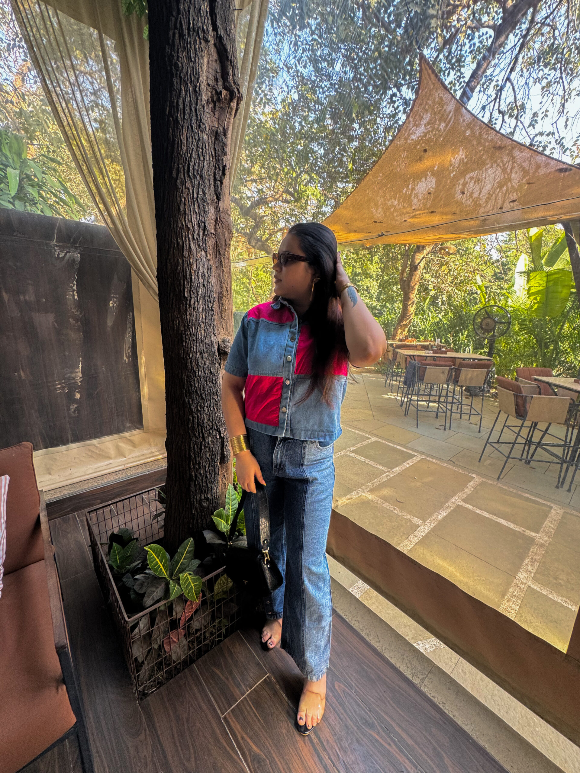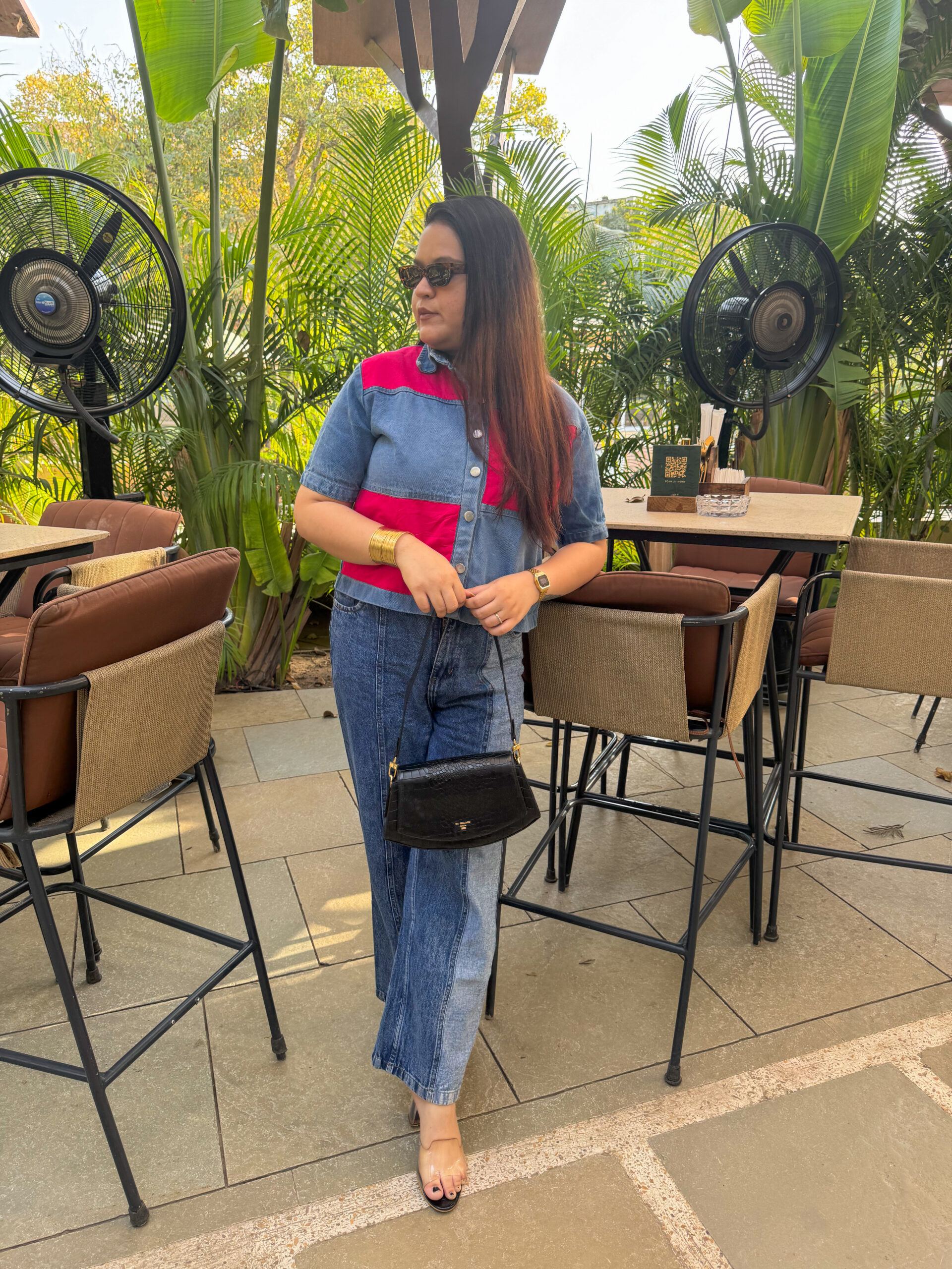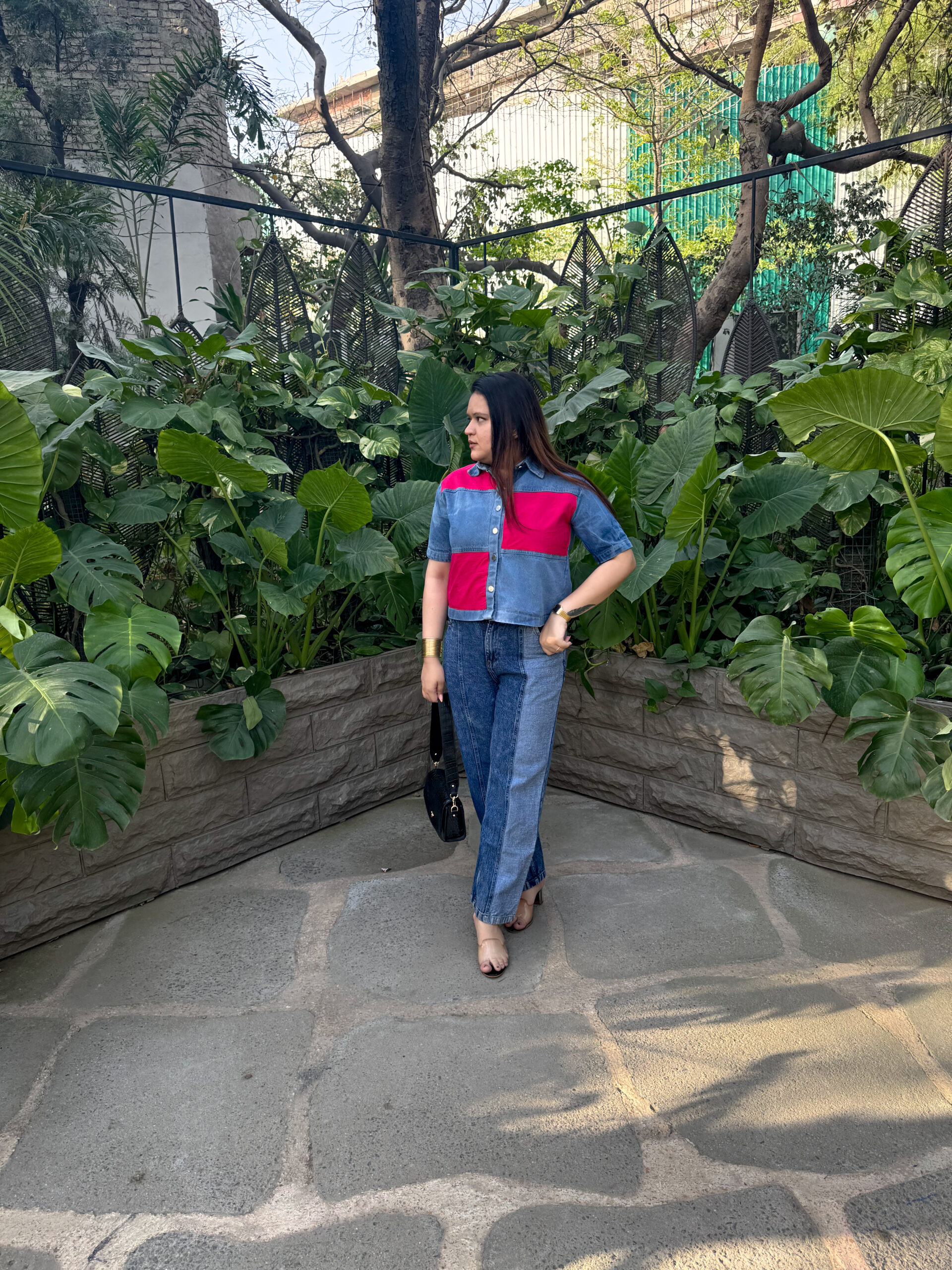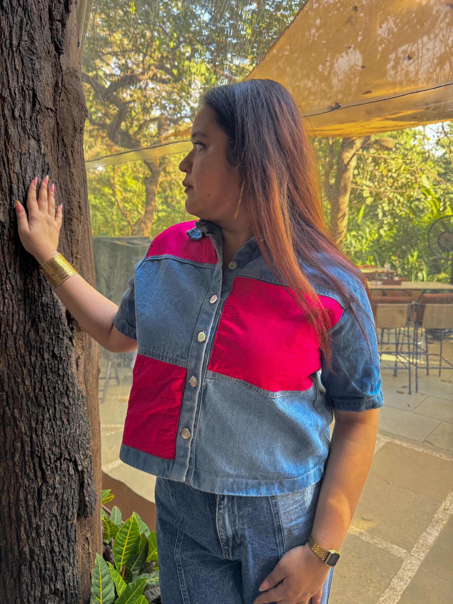 This shirt is a trendy, color-blocked piece combining classic denim with bold, vibrant pink panels. Featuring a medium-wash denim base accented with striking red panels, this boxy-fit shirt brings the perfect dose of edge to your everyday wardrobe. With its structured silhouette, silver-toned buttons, and clean panel lines, it’s your go-to for effortless street-style slay. Pair it with jeans for a denim-on-denim moment or contrast it with neutrals to let the color speak.